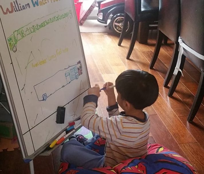 The whiteboard had been his canvas whilst he drew fire engines and fire engine characters.