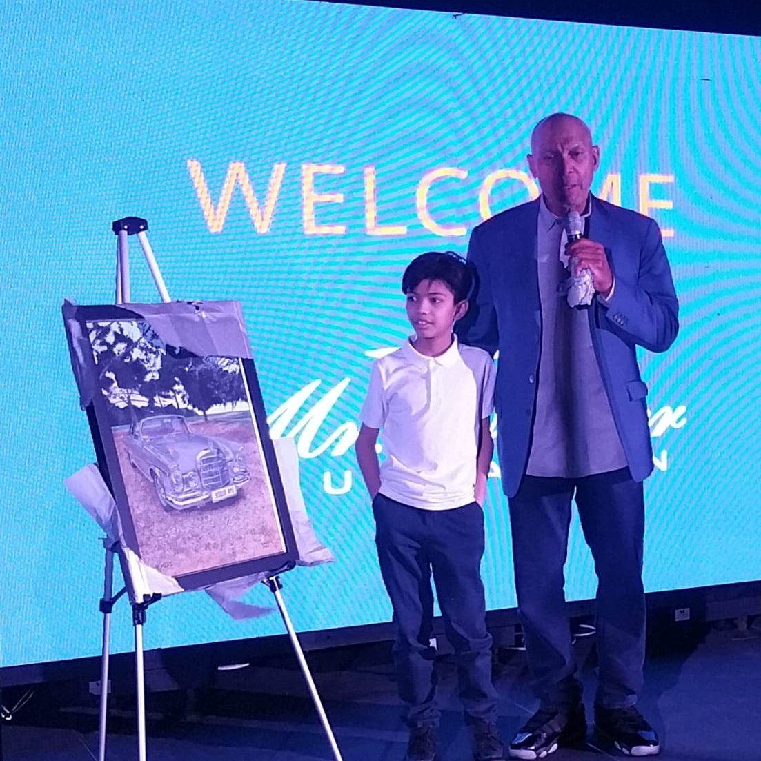 Aran on stage presenting his painting to Reggie Jackson